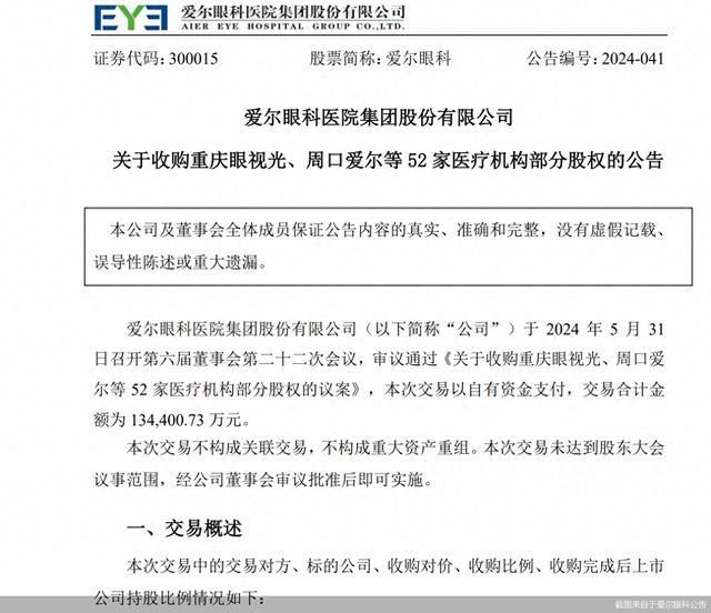 爱尔眼科最新公告显示,公司于5月31日召开第六届董事会第二十二次会议,审议通过《关于收购重庆眼视光、周口爱尔等52家医疗机构部分股权的议案》,拟收购重庆眼视光、周口爱尔等52家医疗机构部分股权,本次交易以自有资金支付,交易合计金额为13.44亿元。