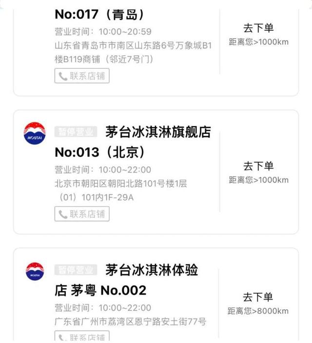 据茅台冰淇淋小程序,目前有7家茅台冰淇淋旗舰店处于暂停营业状态,囊括了北京、广州、深圳、青岛等多个主要城市的门店,此外成都万象城店状态为搬迁中。