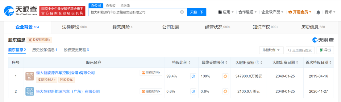 恒大新能源汽车投资控股集团有限公司成立于2019年1月,法定代表人为刘伟胜,注册资本35亿美元,经营范围为在国家允许外商投资的领域依法进行投资(限外商投资企业)。股东信息显示,该公司由恒大新能源汽车控股(香港)有限公司和恒大恒驰新能源汽车(广东)有限公司共同持股。天眼风险信息显示,该公司存在110余条被执行人信息,被执行总金额超21亿,此外该公司还存在多个失信被执行人(老赖)、限制消费令和终本案件信息。