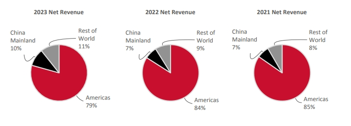 去年,lululemon在主阵地美洲市场驶入了减速带。2022财年,美洲市场营收同比增长29%,而2023财年的营收同比增速下降至12%。其中,2023财年第四财季,lululemon在美洲市场的营收增速从上年同期的29%降至9%。美洲市场是占lululemon全年营收79%的主阵地。