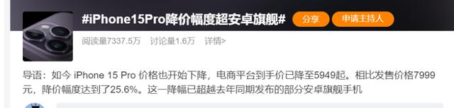 近日,#iPhone15Pro降价幅度超安卓旗舰#话题引爆微博热搜,引发网友热议。