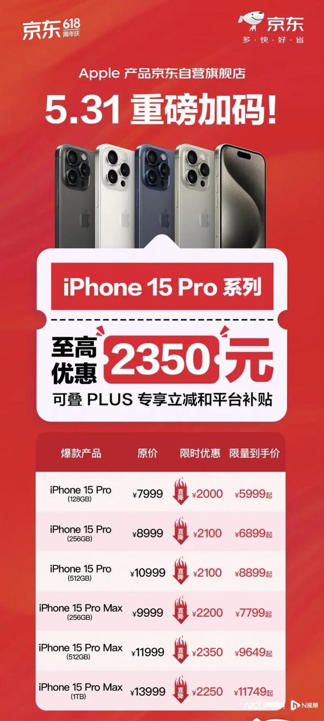 根据最新消息,5月31日,京东再次宣布加大苹果降价幅度,iPhone15 Pro Max最高优惠2350元,iPhone15 Pro直降2100元。