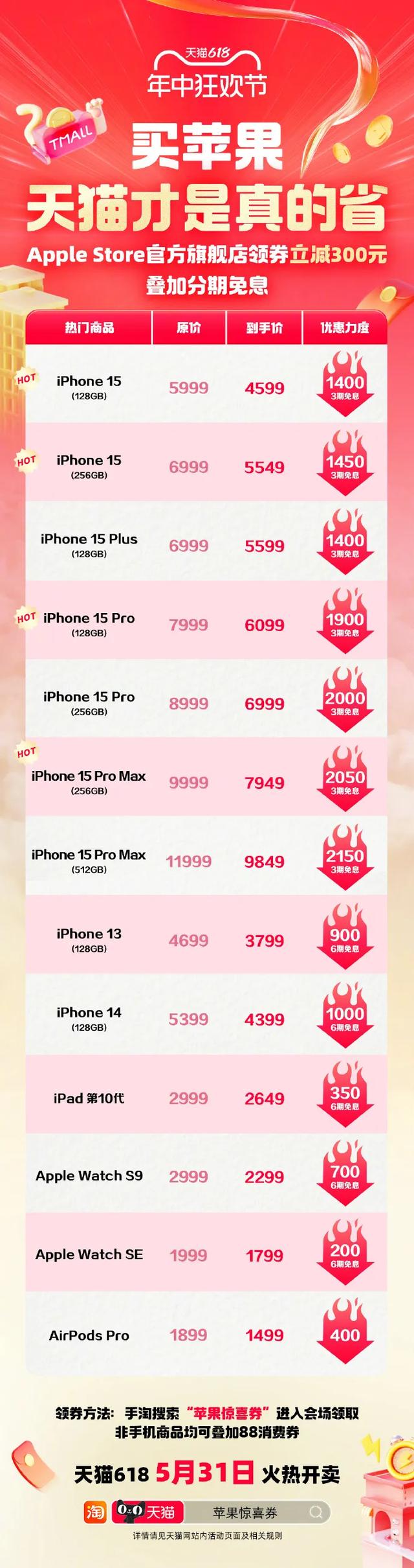 而天猫苹果官旗店也同样进行促销活动,iPhone 15券后价为4599元起,优惠1400元;iPhone 15 Pro券后价6099元起,优惠1900元;iPhone 15 Pro Max最高优惠2150元。