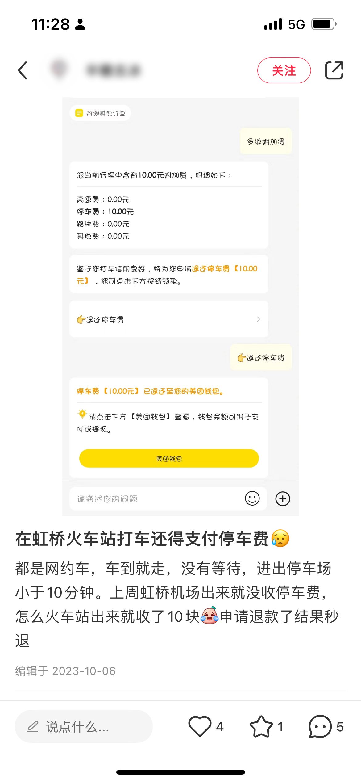 也有乘客发现付费后可以申请退款,“在虹桥火车站打车还得支付停车费。都是网约车,车到就走……火车站出来就收了10块,申请退款了结果秒退。”一网友还附上了美团打车的退款截图。