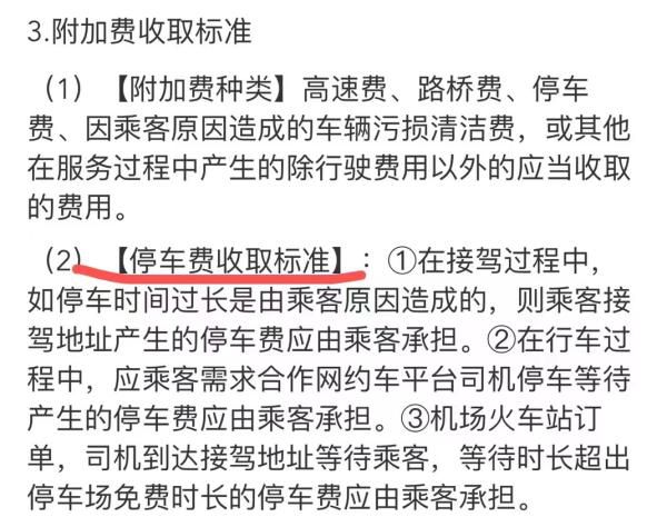 记者又打开美团打车平台,在其法律条款与平台规则-争议场景分类及责任认定规则中的附加费收取标准中,显示了停车费的收取标准:机场火车站订单,司机到达接驾地址等待乘客,等待时长超出停车场免费时长的停车费应由乘客承担。