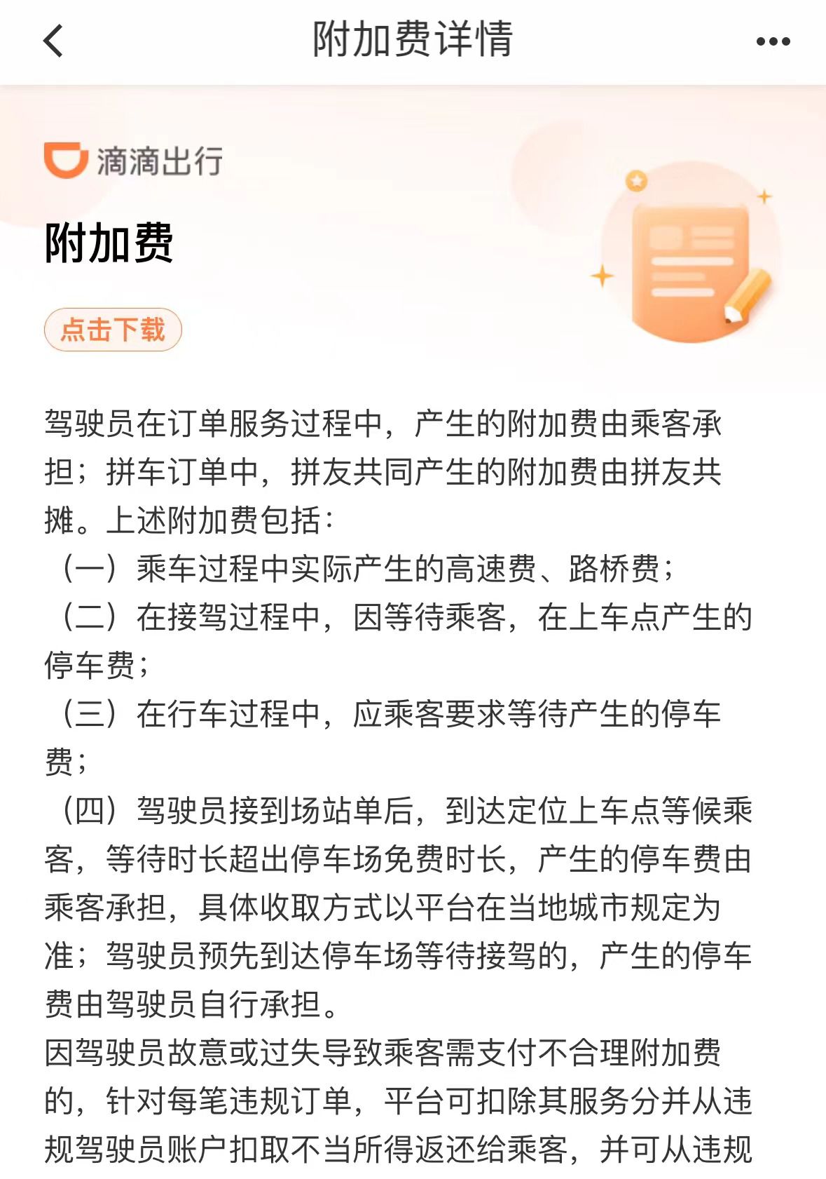 澎湃新闻记者打开滴滴平台,在我的-设置-服务协议与规则-费用规则-附加费中提到,附加费包括:在接驾过程中,因等待乘客,在上车点产生的停车费;驾驶员接到场站单后,到达定位上车点等候乘客,等待时长超出停车场免费时长,产生的停车费由乘客承担,具体收取方式以平台在当地城市规定为准。