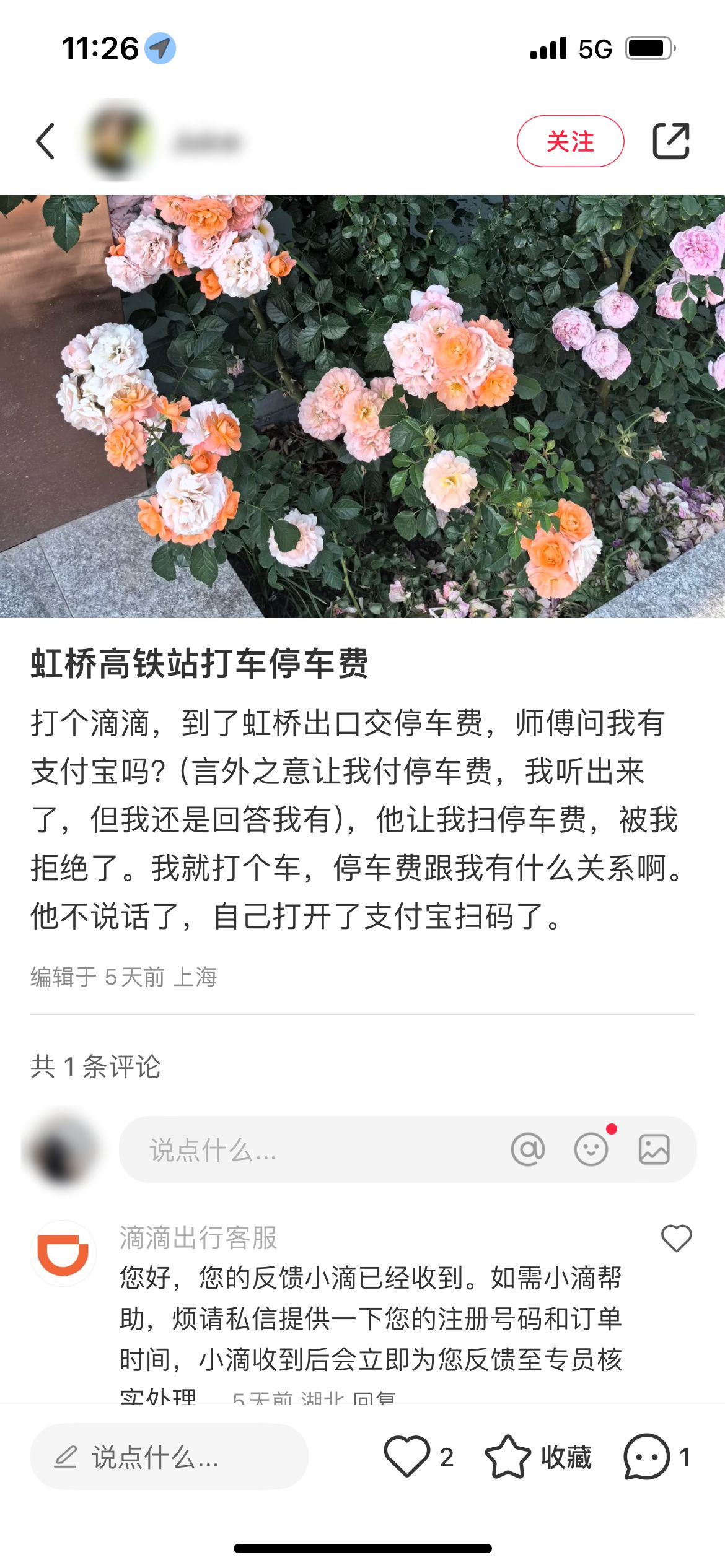 “打个滴滴,到了停车场出口交停车费,师傅问我有支付宝吗?言外之意是让我付停车费,我听出来了,他让我扫停车费,被我拒绝了。我就打个车,停车费跟我有什么关系啊。他不说话了,自己打开了支付宝扫码了。”一名网友发布了几天前在虹桥高铁站打网约车被索要停车费的帖子。