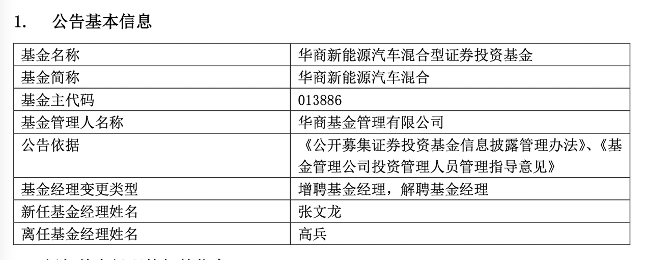 5月29日,华商新能源汽车混合发布基金经理变更公告,5月27日,高兵卸任该基金的基金经理职位,张文龙接任。