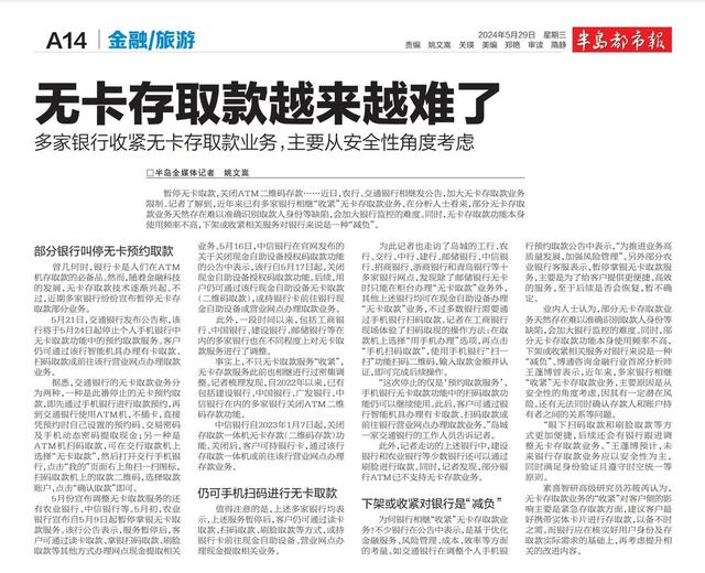 “这次停止的仅是‘预约取款服务’,手机银行无卡取款功能中的扫码取款功能仍可以继续使用。此后,客户可通过银行智能机具办理有卡取款、扫码取款或前往银行营业网点办理取款业务。”岛城一家交通银行的工作人员告诉记者。