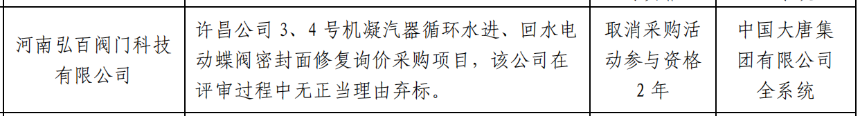 公告显示,河南弘百阀门科技有限公司 ,在许昌公司3、4号机凝汽器循环水进、回水电动蝶阀密封面修复询价采购项目,该公司在评审过程中无正当理由弃标。