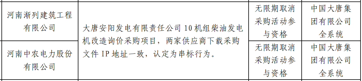 公告显示,河南渐列建筑工程有限公司与河南中农电力股份有限公司 ,在大唐安阳发电有限责任公司 10 机组柴油发电机改造询价采购项目,两家供应商下载采购文件 IP 地址一致,认定为串标行为。