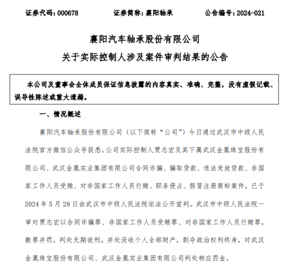 日前,襄阳轴承公告称,公司近日获悉,实控人贾志宏及其下属武汉金凰珠宝股份有限公司、武汉金凰实业集团有限公司合同诈骗、骗取贷款、违法发放贷款、非国家工作人员受贿、对非国家工作人员行贿、职务侵占、假冒注册商标案件,已于2024年5月28日由武汉市中级人民法院依法公开宣判。