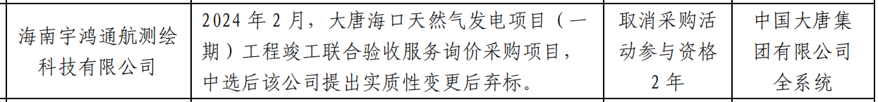 公告显示,海南宇鸿通航测绘科技有限公司,在2024 年 2 月,大唐海口天然气发电项目(一 期)工程竣工联合验收服务询价采购项目, 中选后该公司提出实质性变更后弃标。