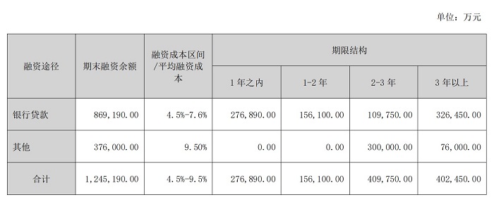 年报信息显示,截至2023年底,中洲控股的融资余额为124.52亿元,其中银行贷款期末融资余额为86.92亿元,其他为37.60亿元。其中银行贷款部分的利率为4.50%至7.60%,其他部分的利率为9.50%。从期限结构来看,上述124.52亿元的融资余额中,有27.69亿元需要在1年之内还款,15.61亿元要在1-2年内还款。