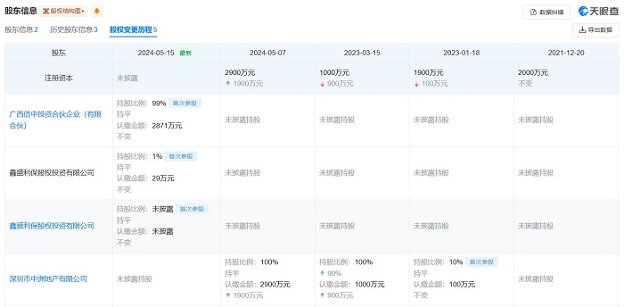 另外,根据深圳市房地产信息平台的信息,迎玺花园的卖方是深圳市黄金台项目开发有限公司(下称“黄金台项目”)。而天眼查显示,黄金台项目的股东在今年5月15日由深圳市中洲地产有限公司(100%持股)变更为广西信中投资合伙企业(有限合伙)和鑫盛利保股权投资有限公司,均为信达资本旗下的企业。