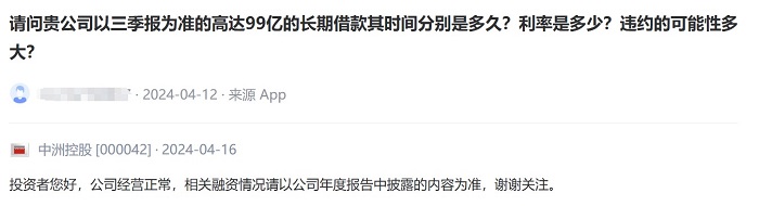 值得一提的是,今年4月12日,有投资者通过深交所互动易平台咨询中洲控股“三季报中高达99亿元的借款出现债务违约的可能性有多大?”
