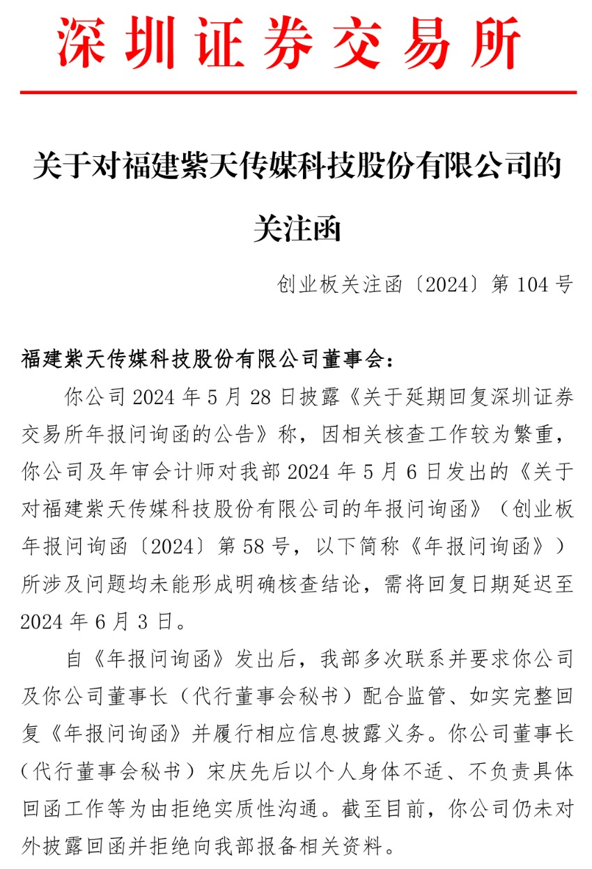 5月28日晚,深交所向紫天科技下发关注函。关注函称,自《年报问询函》发出后,深交所创业板公司管理部多次联系并要求紫天科技及公司董事长(代行董事会秘书)配合监管、如实完整回复《年报问询函》并履行相应信息披露义务。