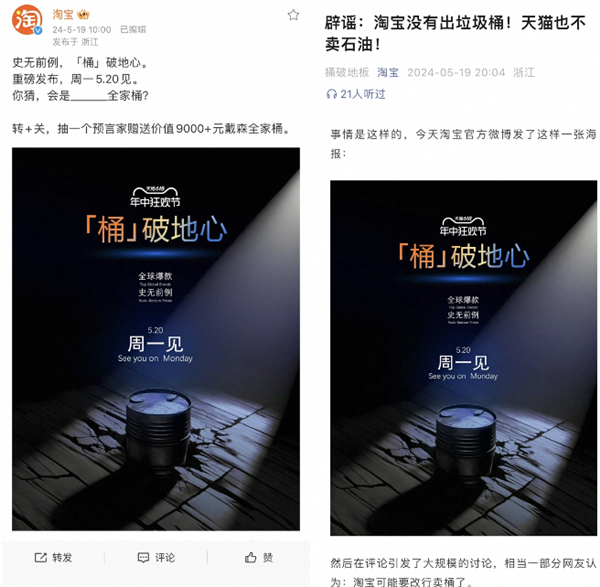 此前的5月19日,天猫618开卖前一天,淘宝发布“桶破地心”全家桶预告海报时,便有众多网友“在线许愿”:请把苹果、戴森、LV、海蓝之谜、特斯拉、黄金的价格打下来。因海报中有油桶的形象,还有网友猜测淘宝是不是要卖石油了,后被淘宝官方辟谣称“绝对不卖石油”。