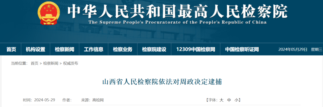 中粮集团有限公司原党组成员、副总经理周政涉嫌受贿、贪污、国有公司人员滥用职权一案,由国家监察委员会调查终结,移送检察机关审查起诉。日前,经最高人民检察院指定管辖,山西省人民检察院依法以涉嫌受贿罪、贪污罪、国有公司人员滥用职权罪对周政作出逮捕决定。该案正在进一步办理中。