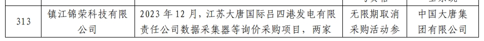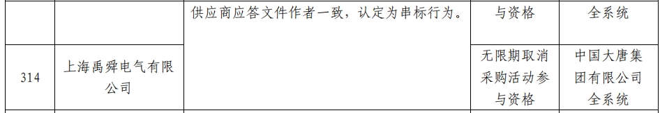 其中,镇江锦荣科技有限公司和上海禹舜电气有限公司在2023 年 12 月,江苏大唐国际吕四港发电有限责任公司数据采集器等询价采购项目,两家供应商应答文件作者一致,认定为串标行为。处理措施:无限期取消采购活动参与资格。处理范围:中国大唐集团有限公司全系统。