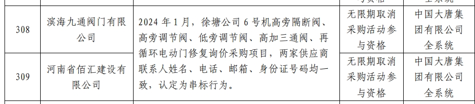 其中,滨海九通阀门有限公司和河南省佰汇建设有限公司因2024 年 1 月,徐塘公司 6 号机高旁隔断阀、 高旁调节阀、低旁调节阀、高加三通阀、再循环电动门修复询价采购项目,两家供应商联系人姓名、电话、邮箱、身份证号码均一 致,认定为串标行为。处理措施:无限期取消采购活动参与资格。处理范围:中国大唐集团有限公司全系统。
