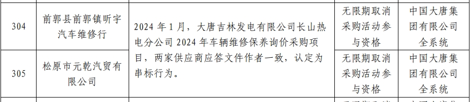 其中,前郭县前郭镇昕宇汽车维修行和松原市元乾汽贸有限公司因2024 年 1 月,大唐吉林发电有限公司长山热 电分公司 2024 年车辆维修保养询价采购项 目,两家供应商应答文件作者一致,认定为串标行为。处理措施:无限期取消采购活动参与资格。处理范围:中国大唐集团有限公司全系统。