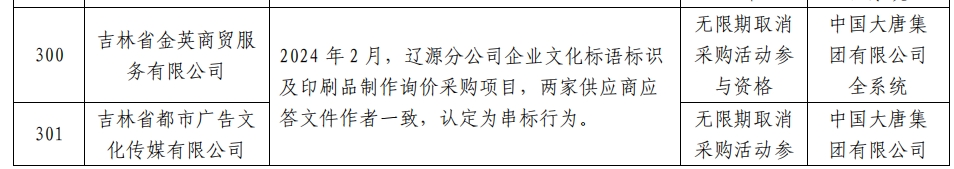 其中,吉林省金英商贸服务有限公司和吉林省都市广告文化传媒有限公司 因2024 年 2 月,辽源分公司企业文化标语标识 及印刷品制作询价采购项目,两家供应商应答文件作者一致,认定为串标行为。处理措施:无限期取消采购活动参与资格。处理范围:中国大唐集团有限公司全系统。