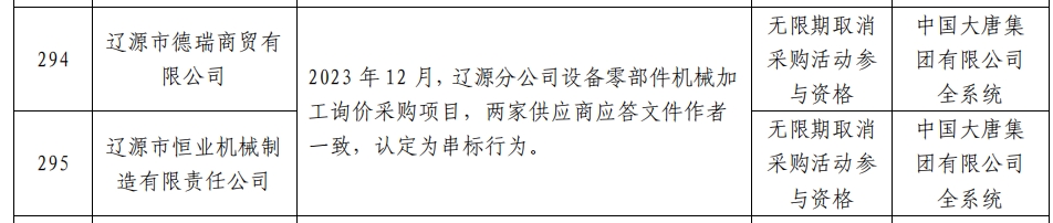 其中,辽源市德瑞商贸有限公司和辽源市恒业机械制造有限责任公司2023 年 12 月,辽源分公司设备零部件机械加 工询价采购项目,两家供应商应答文件作者一致,认定为串标行为。处理措施:无限期取消采购活动参与资格。处理范围:中国大唐集团有限公司全系统。