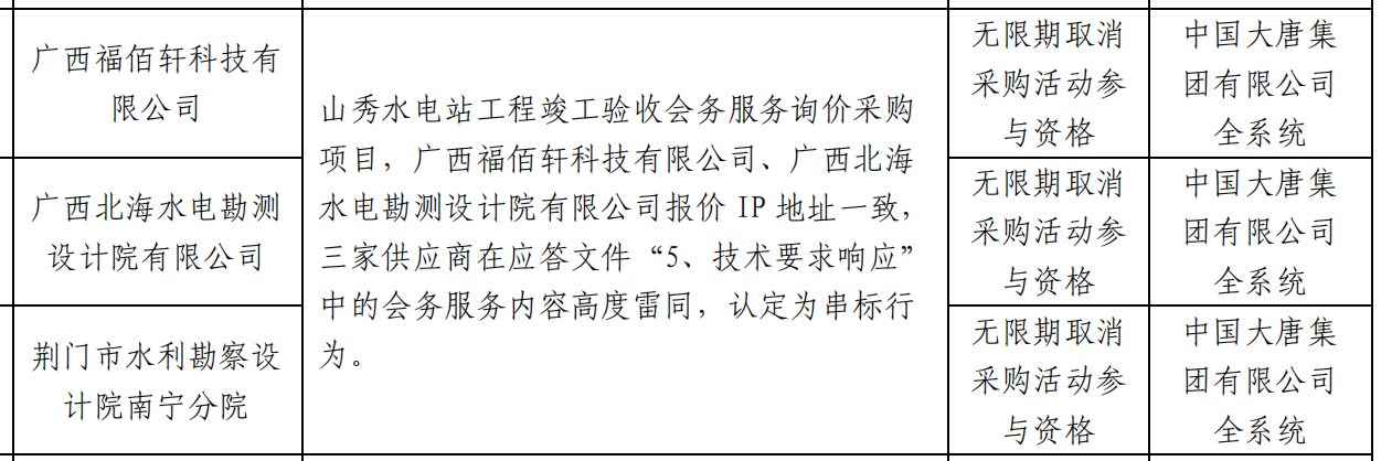 公告显示,广西福佰轩科技有限公司、广西北海水电勘测设计院有限公司和荆门市水利勘察设计院南宁分院 ,在山秀水电站工程竣工验收会务服务询价采购项目,广西福佰轩科技有限公司、广西北海水电勘测设计院有限公司报价 IP 地址一致,三家供应商在应答文件“5、技术要求响应”中的会务服务内容高度雷同,认定为串标行为。