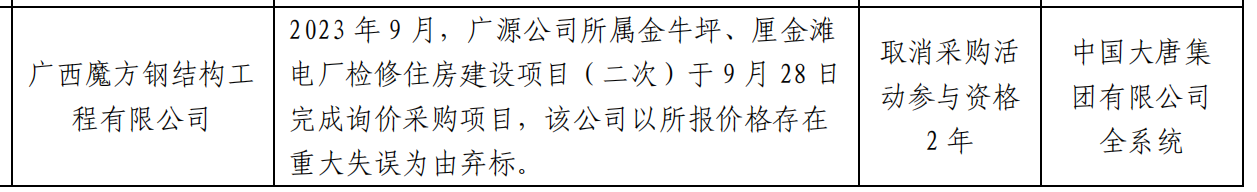 公告显示,广西魔方钢结构工程有限公司,在2023 年 9 月,广源公司所属金牛坪、厘金滩电厂检修住房建设项目(二次)于 9 月 28 日完成询价采购项目,该公司以所报价格存在重大失误为由弃标。
