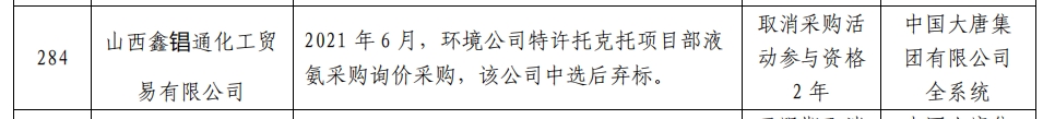 其中,山西鑫锠通化工贸易有限公司因2021年6月,环境公司特许托克托项目部液氨采购询价采购中选中选后弃标。处理措施:取消采购活动参与资格2年。处理范围:中国大唐集团有限公司全系统。