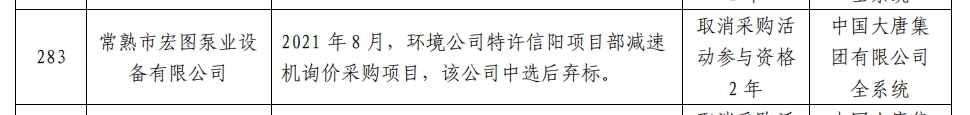 其中,常熟市宏图泵业设备有限公司因2021年8月,环境公司特许信阳项目部减速机询价采购项目中选后弃标。处理措施:取消采购活动参与资格2年。处理范围:中国大唐集团有限公司全系统。