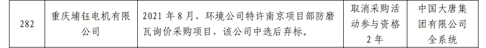 其中,重庆埔钰电机有限公司因2021年8月,环境公司特许南京项目部防磨瓦询价采购项目中选后弃标。处理措施:取消采购活动参与资格2年。处理范围:中国大唐集团有限公司全系统。