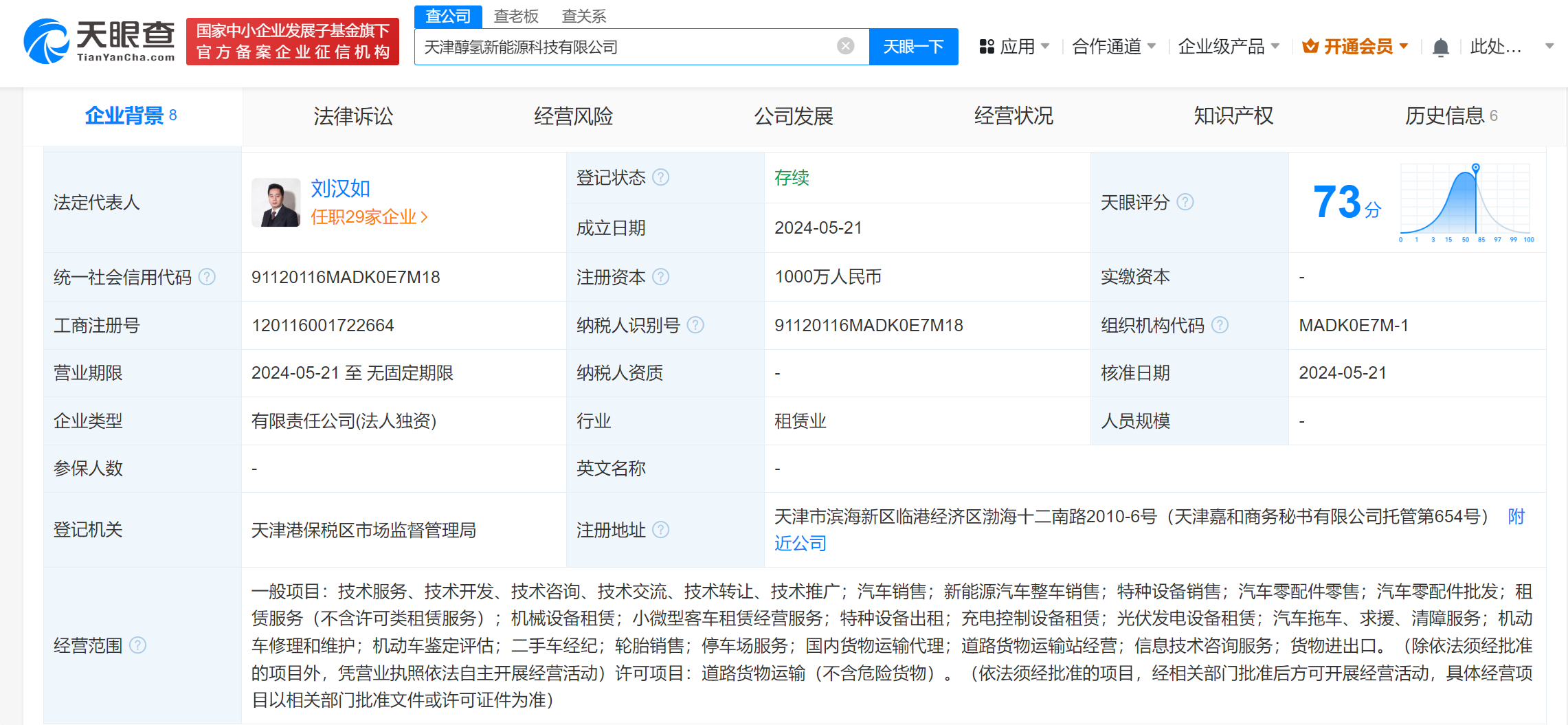 天眼查App显示,近日,天津醇氢新能源科技有限公司成立,法定代表人为刘汉如,注册资本1000万人民币,经营范围含汽车销售、新能源汽车整车销售、特种设备销售、汽车零配件零售、汽车零配件批发、小微型客车租赁经营服务、特种设备出租、充电控制设备租赁等,由吉利旗下浙江醇氢科技有限公司全资持股。