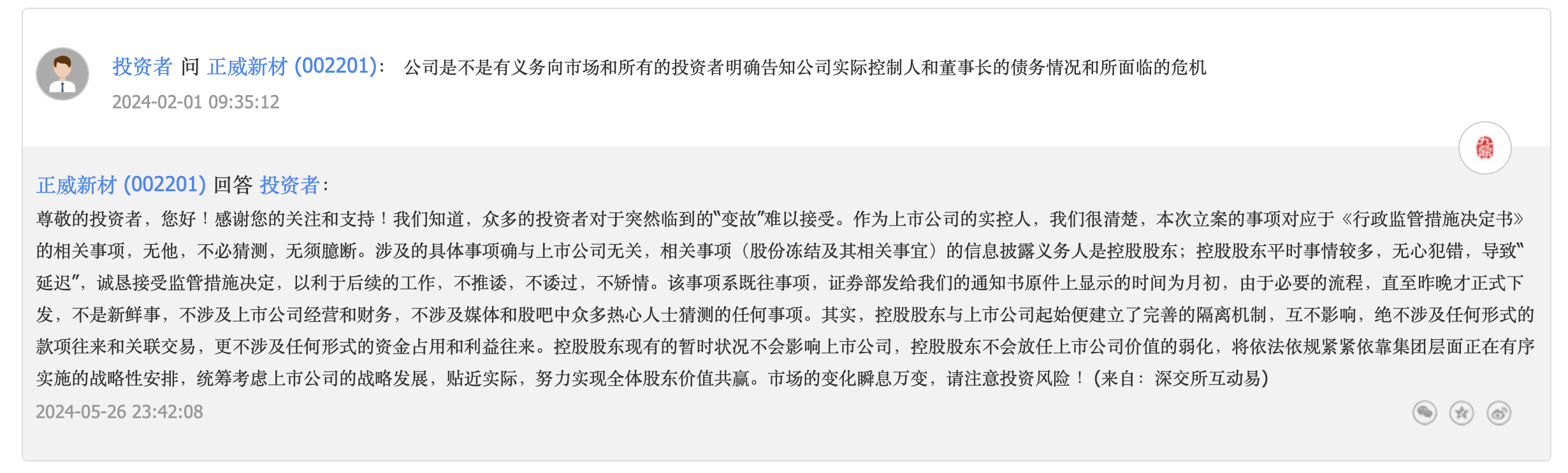 正威新材5月26日在互动易平台回复投资者称,公司股份冻结及其相关事宜的信息披露义务人,是控股股东深圳翼威,深圳翼威“平时事情较多,无心犯错,导致‘延迟’,诚恳接受监管措施决定”。控股股东与上市公司起始便建立了完善的隔离机制,互不影响。