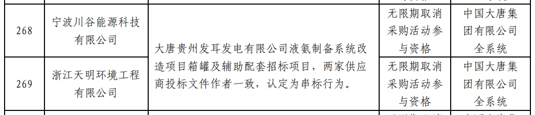 其中,宁波川谷能源科技有限公司和浙江天明环境工程有限公司因大唐贵州发耳发电有限公司液氨制备系统改造项目箱罐及辅助配套招标项目,两家供应商投标文件作者一致,认定为串标行为。处理措施:无限期取消采购活动参与资格。处理范围:中国大唐集团有限公司全系统。