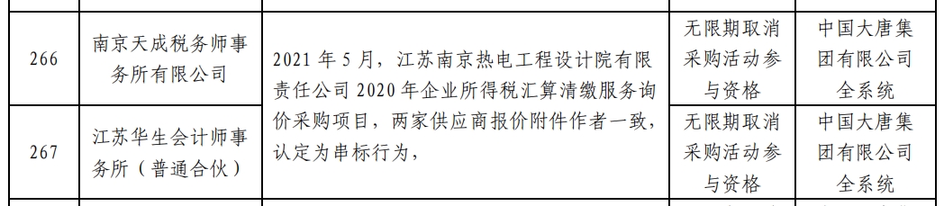 其中,南京天成税务师事务所有限公司和江苏华生会计师事务所(普通合伙)因2021 年 5 月,江苏南京热电工程设计院有限责任公司 2020 年企业所得税汇算清缴服务询价采购项目,两家供应商报价附件作者一致,认定为串标行为。处理措施:无限期取消采购活动参与资格。处理范围:中国大唐集团有限公司全系统。