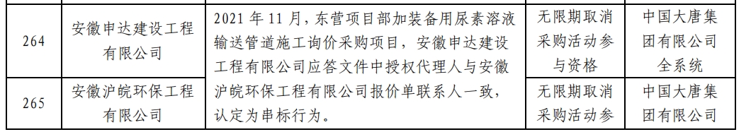 其中,安徽申达建设工程有限公司和安徽沪皖环保工程有限公司因2021 年 11 月,东营项目部加装备用尿素溶液输送管道施工询价采购项目,安徽申达建设工程有限公司应答文件中授权代理人与安徽沪皖环保工程有限公司报价单联系人一致,认定为串标行为。处理措施:无限期取消采购活动参与资格。处理范围:中国大唐集团有限公司全系统。