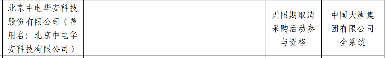 相关处理措施为,无限期取消采购活动参与资格。处理范围为,中国大唐集团有限公司全系统 。