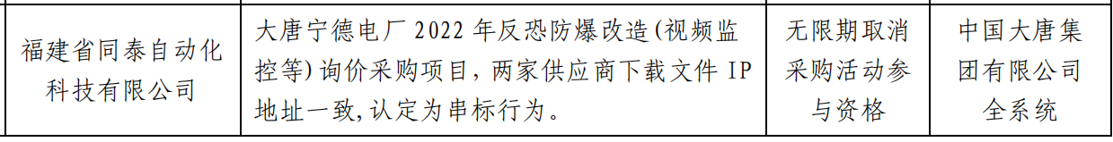 公告显示,福建省同泰自动化科技有限公司与北京中电华安科技股份有限公司(曾 用名:北京中电华安科技有限公司),在大唐宁德电厂2022 年反恐防爆改造(视频监 控等)询价采购项目,两家供应商下载文件 IP 地址一致,认定为串标行为。