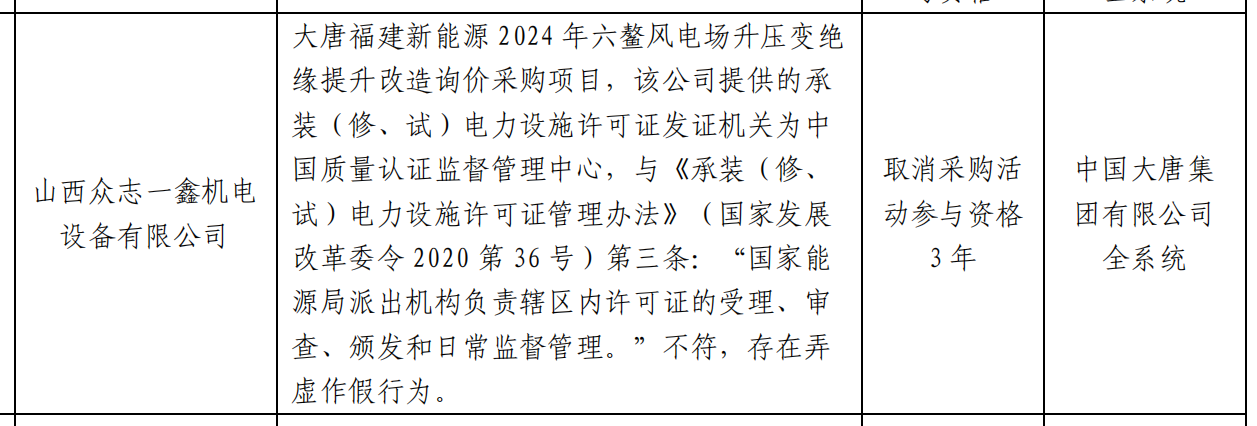 公告显示,山西众志一鑫机电设备有限公司 ,在大唐福建新能源 2024 年六鳌风电场升压变绝缘提升改造询价采购项目,该公司提供的承装(修、试)电力设施许可证发证机关为中 国质量认证监督管理中心,与《承装(修、 试)电力设施许可证管理办法》(国家发展改革委令 2020 第 36 号)第三条:“国家能源局派出机构负责辖区内许可证的受理、审查、颁发和日常监督管理。”不符,存在弄虚作假行为。