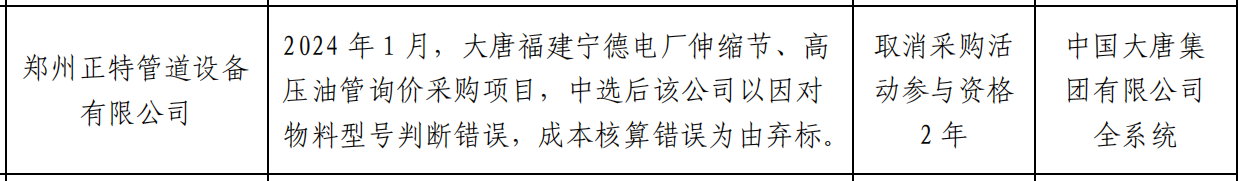 公告显示,郑州正特管道设备有限公司,在2024 年 1 月,大唐福建宁德电厂伸缩节、高压油管询价采购项目,中选后该公司以因对物料型号判断错误,成本核算错误为由弃标。