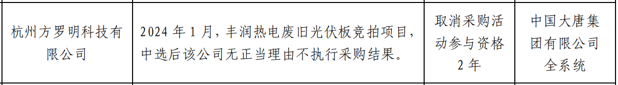 公告显示,杭州方罗明科技有限公司 ,在2024 年 1 月,丰润热电废旧光伏板竞拍项目, 中选后该公司无正当理由不执行采购结果。