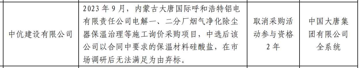 公告显示,中伉建设有限公司,在2023 年 9 月,内蒙古大唐国际呼和浩特铝电有限责任公司电解一、二分厂烟气净化除尘器保温治理等施工询价采购项目,中选后该 公司以合同中要求的保温材料硅酸盐,在市场调研后无法满足为由弃标。