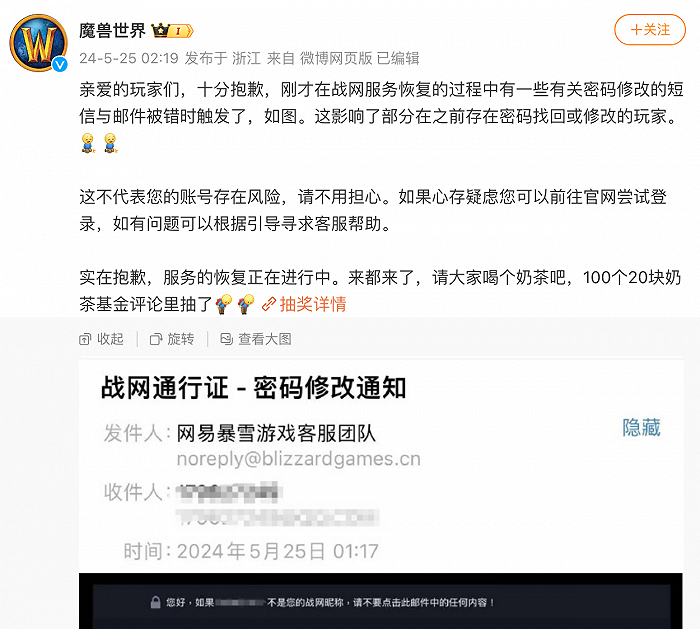 5月25日凌晨,@魔兽世界 发文称,在战网服务恢复的过程中有一些有关密码修改的短信与邮件被错时触发,影响了部分在之前存在密码找回或修改的玩家。这不代表账号存在风险,如果玩家心存疑虑可前往官网尝试登录。服务的恢复正在进行中。