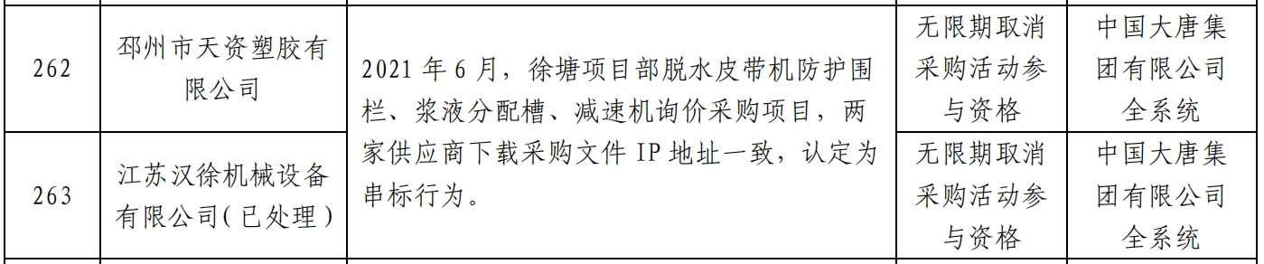 其中,邳州市天资塑胶有限公司和江苏汉徐机械设备有限公司(已处理)因2021 年 6 月,徐塘项目部脱水皮带机防护围栏、浆液分配槽、减速机询价采购项目,两家供应商下载采购文件 IP 地址一致,认定为串标行为。处理措施:无限期取消采购活动参与资格。处理范围:中国大唐集团有限公司全系统。