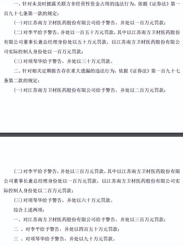 针对以上问题,深交所对江苏南方卫材医药股份有限公司给予警告,并处以三百万元罚款;对李平给予警告,并处以四百五十万元罚款;对项琴华给予警告,并处以九十万元罚款。