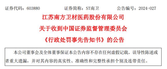5月22日,江苏南方卫材医药股份有限公司(以下简称“ST南卫”或“南卫股份)发布关于收到中国证券监督管理委员会《行政处罚事先告知书》的公告。
