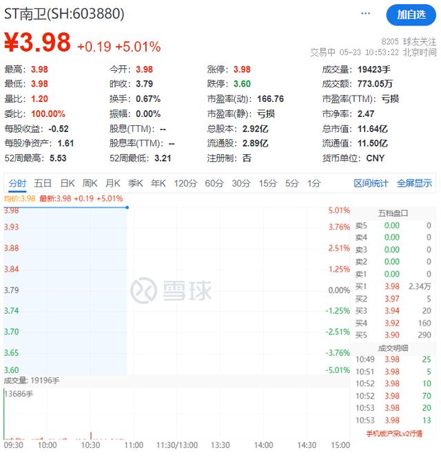不过,截至5月23日10:53,ST南卫股价一字涨停,上涨5.01%,报3.98元,总市值为11.64亿元。