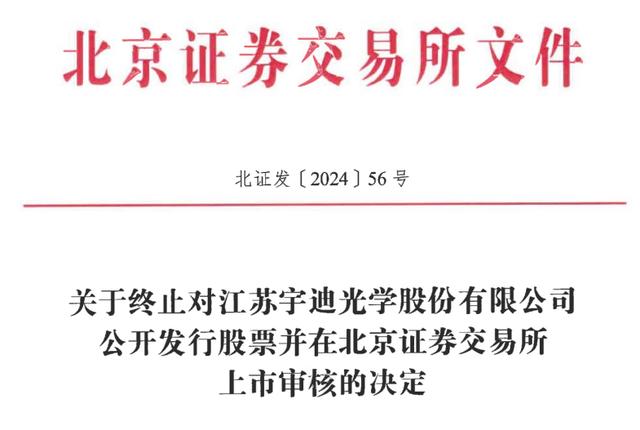 近日,北交所发布关于终止对江苏宇迪光学股份有限公司(以下简称“宇迪光学”)公开发行股票并在北京证券交易所上市审核的决定。